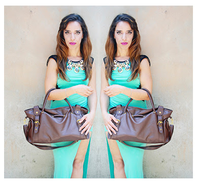 Para verem melhor como ficam o colar e a mala, pedi à minha amiga Patricia para me servir de cabide (sim, as minhas amigas são voluntárias à força para me servirem de modelos):